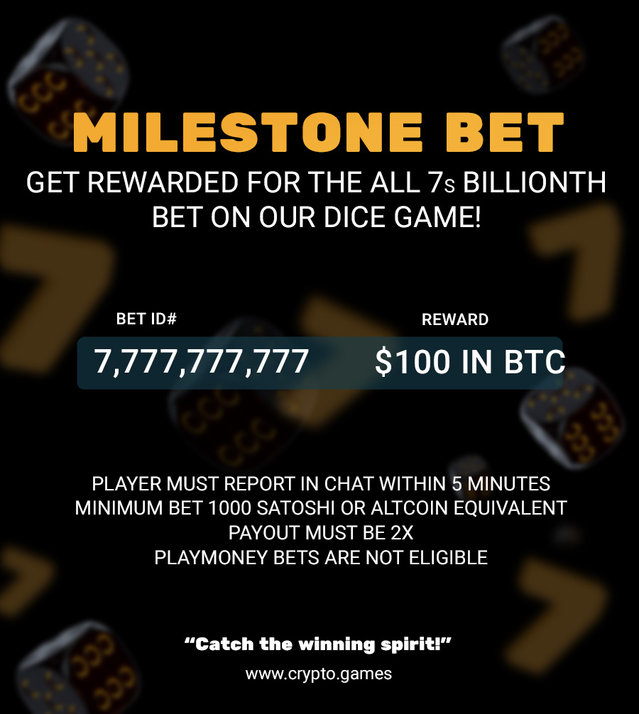 Homeannouncement The 7,777,777,777th dice bet! December 16, 2022 0 Be sure to join us for a chance to win $100 in BTC!Just 6m bets to go until we hit the 7,777,777,777th dice bet!https://crypto.games/dice/bitcoin Tags: announcement bitcoin dice event giveaway milestone prize promotions reward Facebook Twitter